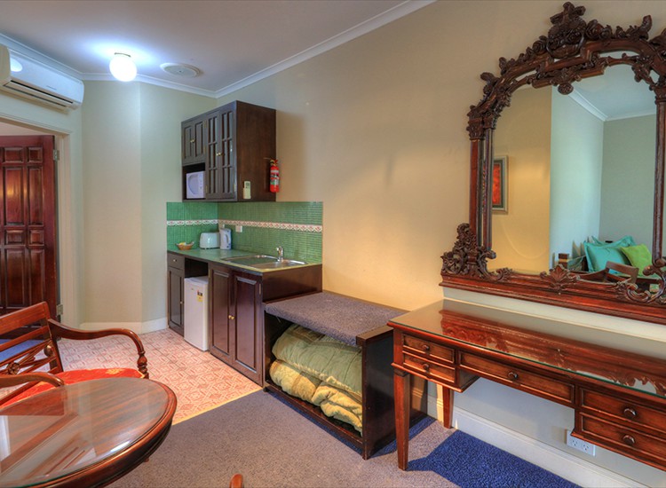 The suite features a lounge room with a kitchenette and dining table and a corner lounge that converts to two full-size king single beds.